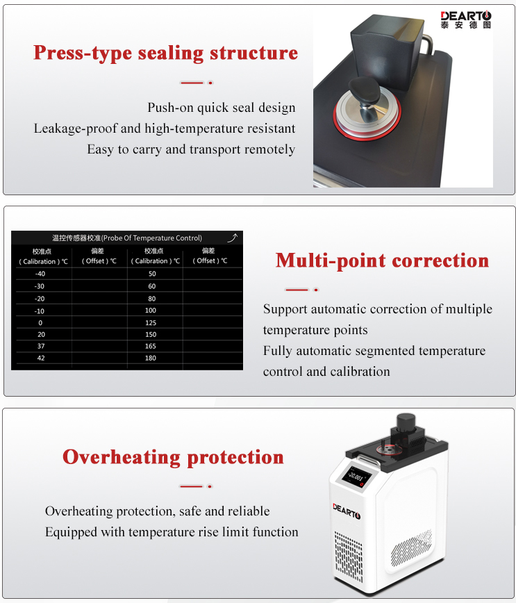 DTS-BG Portable Smart Calibration Bath is a high-precision, self-regulating temperature calibration device. It features excellent stability, a uniform temperature field, and accurate temperature control. Utilizing a fully enclosed compressor refrigeration system and intelligent PID regulation, it achieves automatic temperature control.